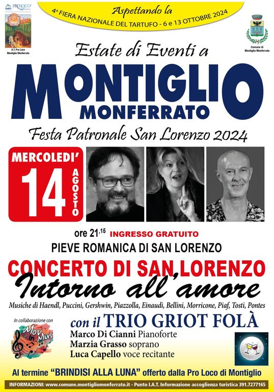 Il tema centrale della serata sarà l’amore, declinato attraverso le note di grandi maestri e le interpretazioni appassionate dei membri del trio. Al termine del concerto, la Pro Loco di Montiglio offrirà un “Brindisi alla Luna”, creando un momento di convivialità per tutti i partecipanti.