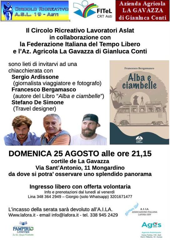 Filo rosso dell'incontro il dialogo tra viaggi, fotografia e scrittura. L'appuntamento, organizzato dal Circolo Ricreativo Lavoratori Asl At in collaborazione con la Federazione Italiana del tempo libero e l'azienda agricola La Gavazza, è nel cortile de La Gavazza, in via Sant'Antonio 11.