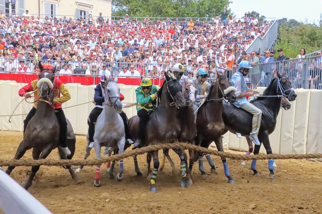 Inizio palio nervoso con ben tre false, il mossiere Andrea Calamassi è costretto a richiamare ufficialmente Montechiaro.