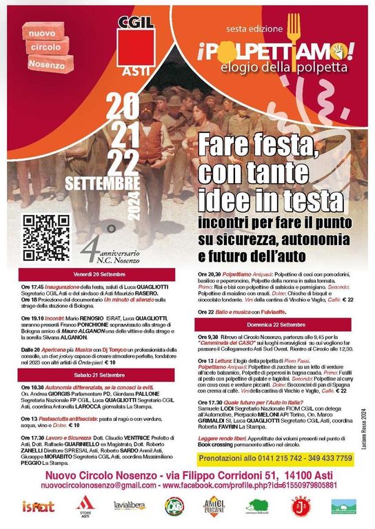 Dal 20 al 22 settembre, il Nuovo Circolo Nosenzo di Asti (via Filippo Corridoni) ospiterà "Polpettiamo! Elogio della Polpetta", un evento (giunto alla sesta edizione, come ricordato dalla presidente del Circolo Monica Marrandino) che unisce momenti di convivialità, riflessione su temi sociali e incontri culturali. L’iniziativa, che celebra anche il quarto anniversario del Nuovo Nosenzo e segna il ritorno della festa della CGIL (co-organizzatrice) dopo ben 18 anni, rappresenta un’occasione per fare il punto su sicurezza, autonomia e il futuro dell’auto, come recita il titolo dell'evento: "Fare festa, con tante idee in testa". Oltre agli incontri di approfondimento e dibattito, l’evento prevede diverse attività ricreative e culturali, tra cui la degustazione di polpette in varie declinazioni e serate musicali.