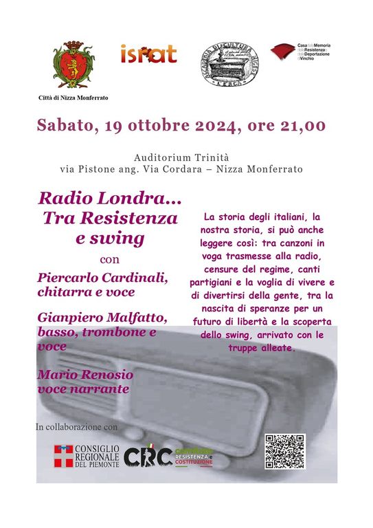 Sabato 19 ottobre si terrà il concerto "Radio Londra", con un repertorio di canzoni popolari, brani proibiti dal regime e swing americano. L'evento, a ingresso libero e gratuito, avrà luogo alle ore 21 presso l’Auditorium Trinità, all'angolo tra via Pistone e via Cordara.
