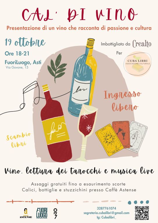 Sabato 19 ottobre dalle ore 18 alle 21, presso il FuoriLuogo di Asti (via Govone 15), un evento imperdibile unirà cultura, tradizione e territorio: la presentazione del vino naturale “Cal Vino”, nato dalla collaborazione tra l’azienda vitivinicola Crealto di Alfiano Natta e l’associazione culturale astigiana Cuba Libri.