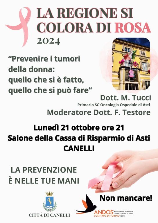 Uno degli eventi principali si terrà lunedì 21 ottobre alle ore 21 presso il Salone della Cassa di Risparmio di Asti, con un incontro dal titolo “Prevenire i tumori della donna: quello che si è fatto, quello che si può fare”. Il relatore sarà il dottor Marcello Tucci, primario di Oncologia dell’Ospedale di Asti, che illustrerà i progressi nella lotta contro il cancro e risponderà alle domande del pubblico. La serata sarà moderata dal dottor Franco Testore, fondatore dell’Oncologia astigiana, e sarà promossa dall’ANDOS (Associazione Nazionale Donne Operate al Seno), con il patrocinio del Comune di Canelli.