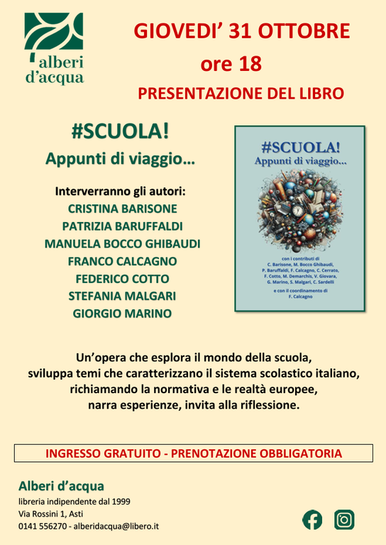 Il 31 ottobre alle ore 18, presso la libreria Alberi d’Acqua di via Rossini 1 ad Asti, si terrà un evento speciale: la presentazione del libro “#Scuola! Appunti di viaggio…”. Questo incontro vedrà la partecipazione di alcuni degli autori, tra cui Cristina Barisone, Patrizia Baruffaldi, Manuela Bocco Ghibaudi, Franco Calcagno, Federico Cotto, Stefania Malgari e Giorgio Marino.