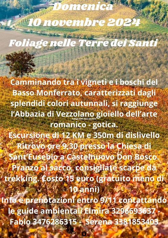 Domenica 10 novembre, un’imperdibile escursione da Castelnuovo Don Bosco all’abbazia di Vezzolano offrirà l’opportunità di immergersi nei suggestivi paesaggi autunnali del Basso Monferrato. Il percorso si snoda tra vigneti e boschi, regalando ai partecipanti una vista mozzafiato sui colori caldi e avvolgenti della stagione.