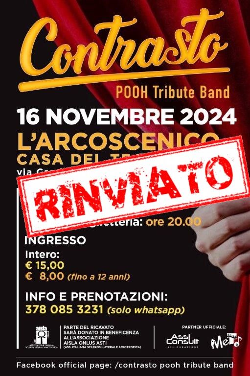Sabato 16 novembre i Contrasto tornano ad Asti per continuare il loro tributo ai Pooh. Il concerto, che si terrà presso l’Arcoscenico - Casa del Teatro 3 di via Scarampi, riproporrà dal vivo i grandi successi che hanno reso celebre la band dagli anni '60 fino ai giorni nostri. Il pubblico potrà godere di un viaggio musicale attraverso i decenni, dai primi brani beat degli anni '60, passando per il rock sinfonico dei '70, fino alle sonorità pop degli anni '80 e oltre.