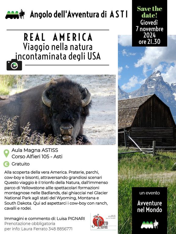 Giovedì 7 novembre, alle ore 21.30, l'aula magna di Astiss (Piazzale De Andrè, ex caserma) ospiterà un nuovo capitolo dei racconti di viaggio della serie “Avventure nel mondo”, con un appuntamento dal titolo “Real America: Viaggio nella natura incontaminata degli USA”.