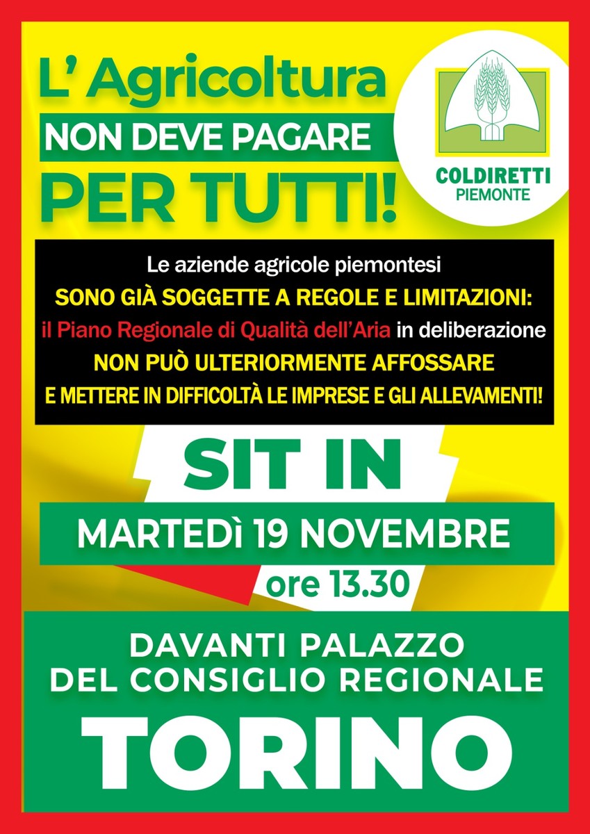 Martedì 19 novembre , dalle 13:30, centinaia di allevatori e agricoltori provenienti da tutto il Piemonte si ritroveranno davanti alla sede del Consiglio Regionale del Piemonte, a Palazzo Lascaris a Torino, per un sit-in organizzato da Coldiretti Piemonte. L'iniziativa ha l'obiettivo di mettere in evidenza le forti criticità del Piano regionale di qualità dell’aria, attualmente in fase di deliberazione, che rischia di penalizzare ulteriormente le imprese agricole del territorio.