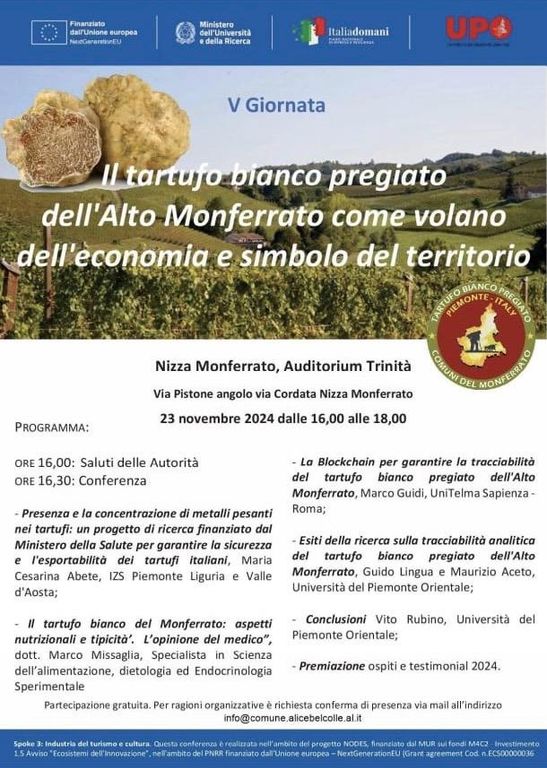 Sabato 23 novembre, dalle ore 16 alle 18, presso l’Auditorium della Trinità, sede dell’Accademia di Cultura Nicese "L’Erca", si terrà un evento dedicato alla valorizzazione di uno dei prodotti più pregiati del territorio: il tartufo bianco.
