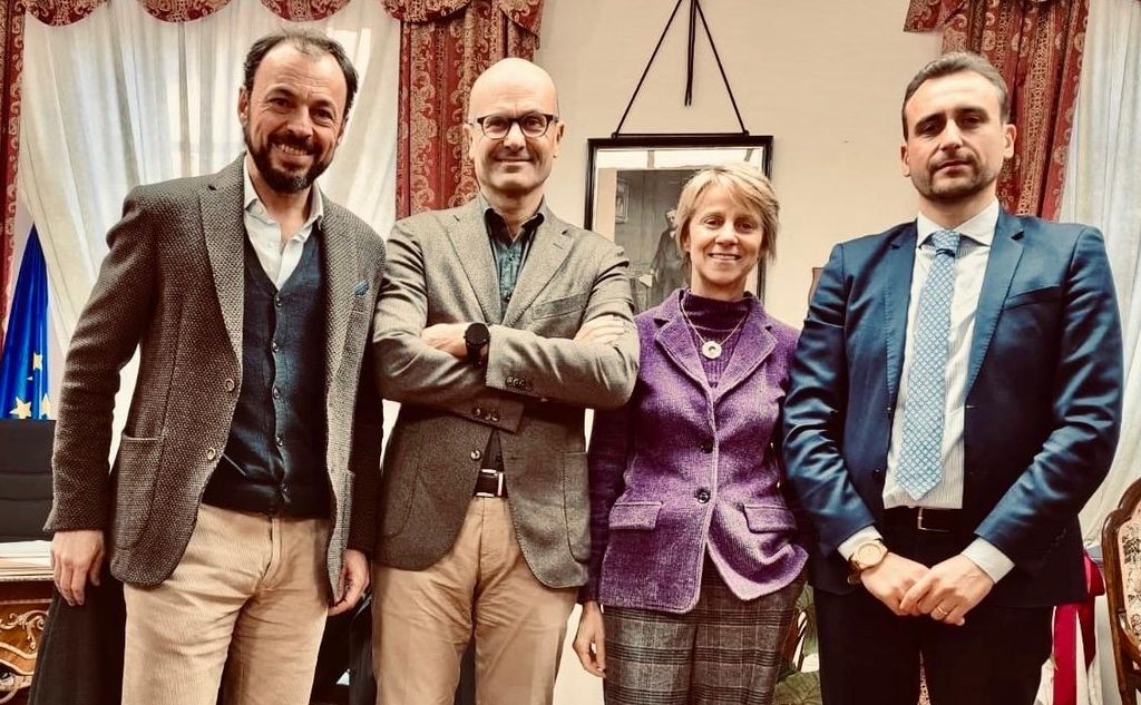 L’incontro a Santena; da sinistra il sindaco Ghio, l’imprenditore Giuseppe Gattino (Vega International), la professoressa Pronello e Dario Kafaie, presidente GIC