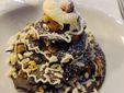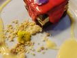 Mille foglie di biscotto sacher con gelato alla frutta secca, glassa lucida al cioccolato(rossa) zabaione tiepido e crumble alla vaniglia