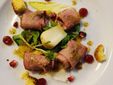 Petto di anatra speziato in lenta cottura robiola di Roccaverano gel al melograno e salsa alla tonda gentile