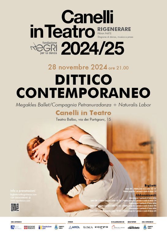 Il teatro Balbo di Canelli si prepara ad accogliere un evento dedicato alla danza contemporanea. Il 28 novembre 2024, alle ore 21, andrà in scena il “Dittico Contemporaneo”, attraverso le coreografie delle compagnie Megakles Ballet / Compagnia Petranuradanza e Naturalis Labor.