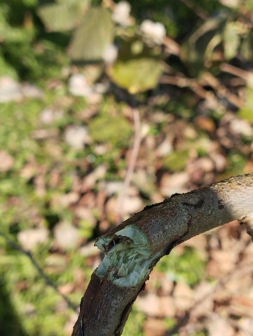 La sperimentazione si è svolta su un appezzamento situato a Cortemilia, comune particolarmente colpito dalla grandinata, su piante di 8 anni con forma di allevamento a cespuglio policaule, esposizione sud-est e giacitura mediamente collinare. La settimana successiva all’evento sono iniziati i lavori di taglio, pulizia, rimozione branche danneggiate e disinfezione dei tagli di potatura e delle numerose ferite sul legno.