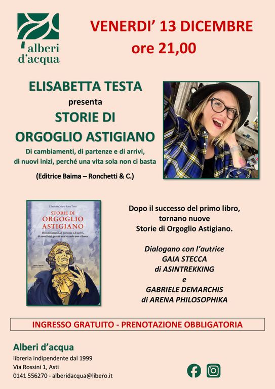 Inizierà dalla Libreria Alberi d'Acqua di Asti il tour delle presentazioni del nuovo libro "Storie di Orgoglio Astigiano. Di cambiamenti, di partenze e di arrivi, di nuovi inizi, perché una vita sola non ci basta", della giornalista Elisabetta Testa, edito da Baima Ronchetti.