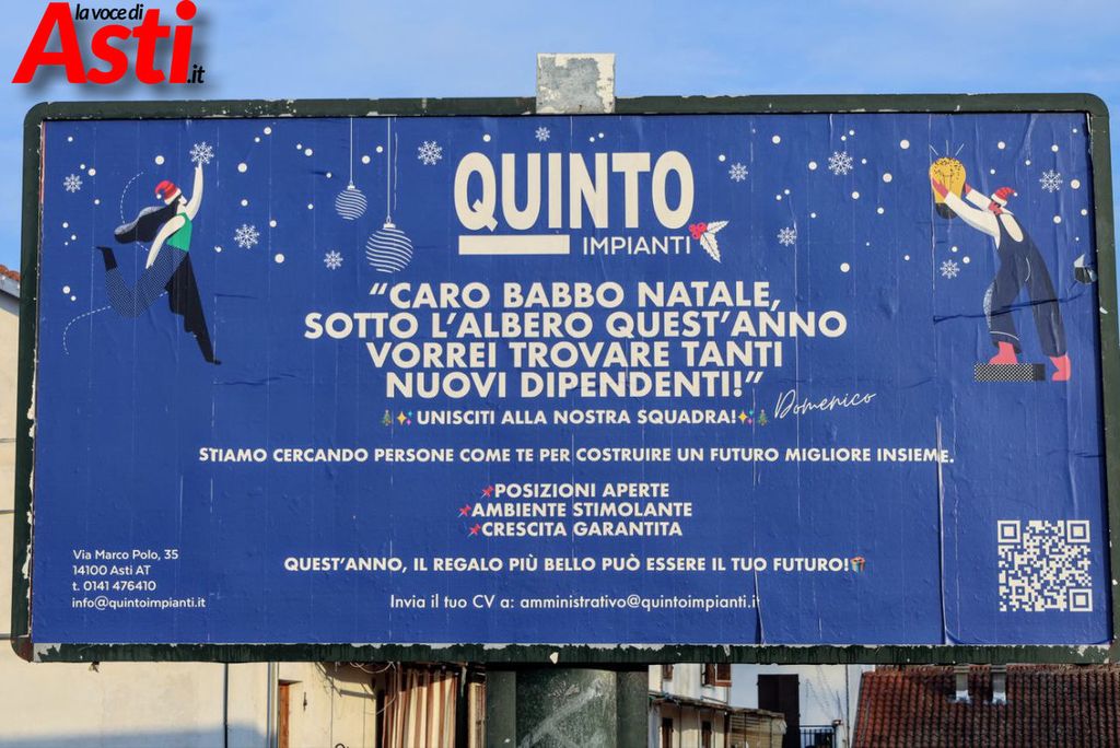 La Quinto Impianti di Asti, 96 dipendenti, che lavora su tutto il Nord Italia, ha bisogno di nuove forze lavoro, circa venti e, per trovarle, si è affidata a un messaggio ben visibile e provocatorio. In città infatti campeggiano i cartelloni augurali che fanno sorridere ma anche pensare. Con la disoccupazione e la povertà che morde anche la nostra provincia possibile sia così difficile trovare dipendenti?