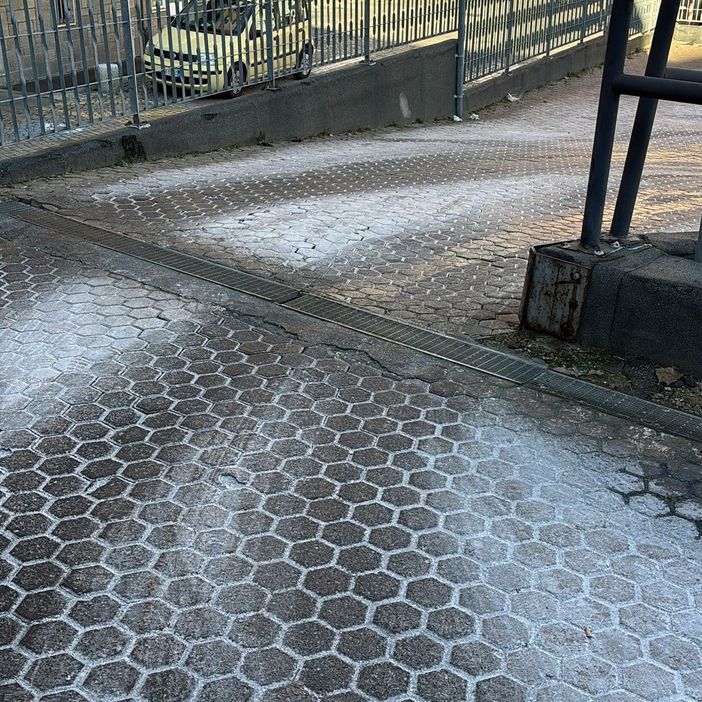 Nelle foto allegate, il parcheggio di via Guttuari, bianco per il ghiaccio.