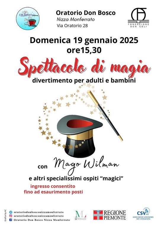Domenica 19 gennaio, a partire dalle 15.30, l’oratorio Don Bosco di Nizza Monferrato ospiterà lo spettacolo di magia organizzato dalla fondazione don Giuseppe Celi assieme al Club magico astigiano.