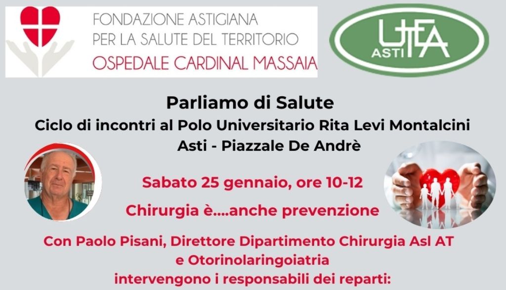 Otto specialisti a confronto con medici di famiglia e cittadini: ha un taglio multidisciplinare la prima conferenza sulla salute promossa sabato 25 gennaio, al polo Universitario Astiss, dalla Fondazione Astigiana per la Salute del Territorio - Cardinal Massaia insieme all’Utea - Università della Terza Età.