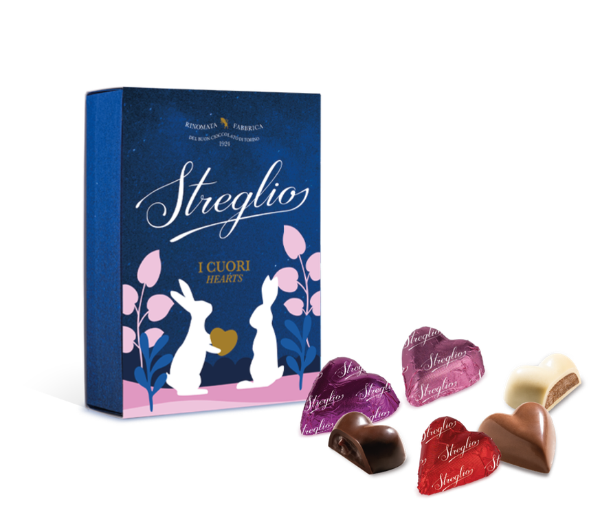 Dai cuori alle margherite, dagli ovetti ai Giandujotti e Turin al Rhum, ogni creazione è un piccolo capolavoro di gusto e tradizione. La confezione speciale di San Valentino, che inaugura la collezione, racchiude al suo interno un assortimento di Cuori Streglio, per un dono che profuma d'amore e di nuova stagione.