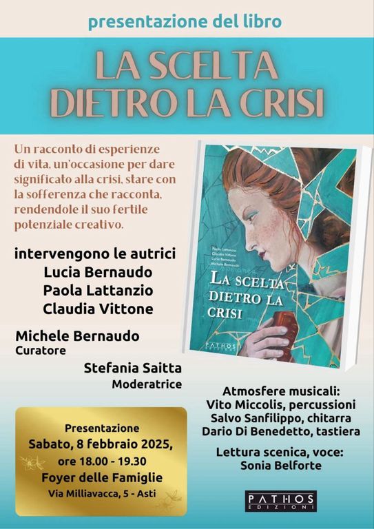 Sabato 8 febbraio, dalle 18 alle 19.30, al Foyer delle famiglie di Asti, si terrà la presentazione del libro “La scelta dietro la crisi”, opera di Lucia Bernaudo, Paola Lattanzio, Claudia Vittone, curata da Michele Bernaudo.