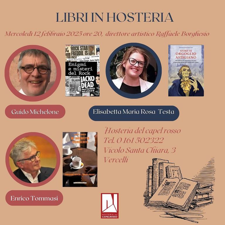 Il prossimo appuntamento sarà mercoledì 12 febbraio alle 20 a Vercelli, all'Hosteria del Capel Rosso (vicolo Santa Chiara 3), nell'ambito della rassegna letteraria "Libri in Hosteria", curata da Raffaele Borghesio.
