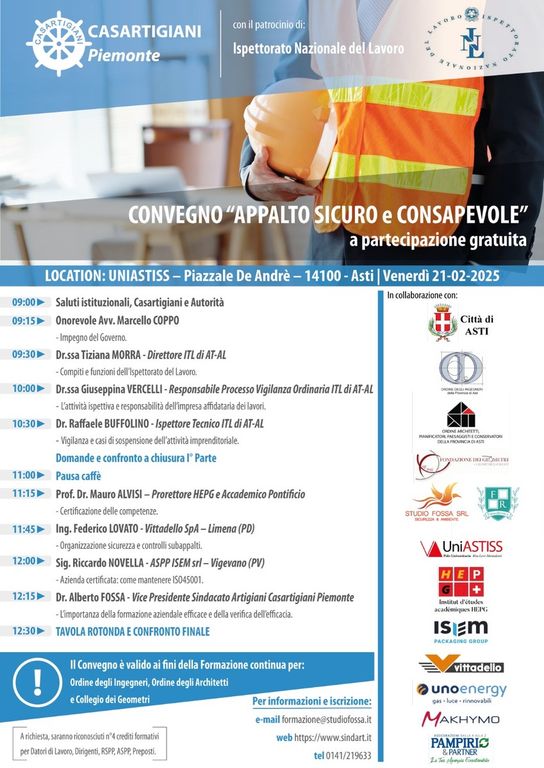 Venerdì 21 febbraio si terrà ad Asti, presso il Polo Universitario ASTISS, il convegno "Appalto sicuro e consapevole", un'iniziativa promossa da Casartigiani Piemonte con il patrocinio dell'Ispettorato Nazionale del Lavoro (INL). L'evento si propone come un momento di approfondimento sui compiti e le funzioni dell'INL, con un focus particolare sull'attività ispettiva, le responsabilità delle imprese e l'importanza della formazione per la sicurezza nei luoghi di lavoro.
