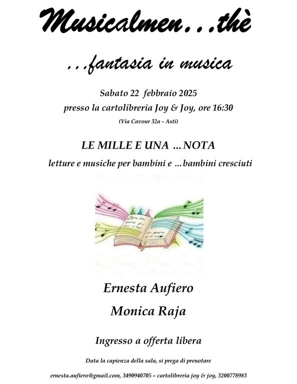 Sabato 22 febbraio alle 16.30, presso la cartolibreria Joy & Joy di Asti, prosegue la rassegna Musicalmen...the' con il secondo appuntamento "Le mille e una nota: letture e musiche, per bambini e... bambini cresciuti".