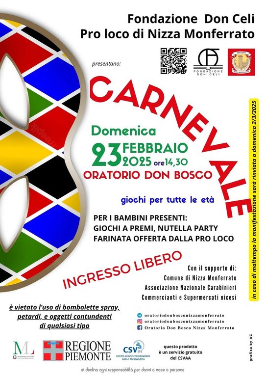 Previsti, per domenica 23 febbraio a partire dalle 14.30, i tradizionali festeggiamenti del Carnevale dei bambini all’oratorio Don Bosco di Nizza Monferrato.