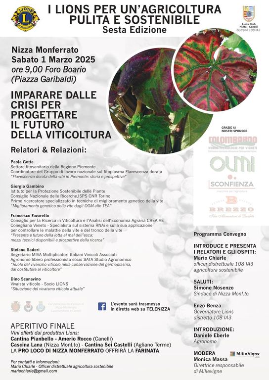 “L’agricoltura sostenibile per noi significa dare l’opportunità a chi produce di avere un lavoro sicuro, inteso come vero e proprio, ma che non vada a inficiare sulla salute in funzione del territorio”, ha raccontato Mario Chiarle, coordinatore Area Agricoltura sostenibile del Lions Club, che ha poi annunciato i relatori che interverranno durante il convegno, esperti del settore come: Paola Gotta, coordinatore del gruppo di lavoro nazionale sul fitoplasma flavescenza dorata; Giorgio Gambino, primo ricercatore specializzato in tecniche di miglioramento genetico della vite; Francesco Favretto, specialista sul sistema RNAi e sulla sua applicazione per controllare le malattie della vite e del tronco della vite; Stefano Saderi, agronomo e socio SATA studio agronomico; Dino Scanavino, vivaista viticolo.