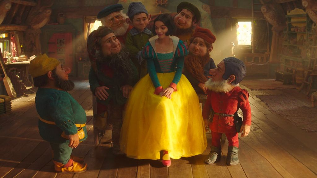 Biancaneve (Rachel Zegler) attorniata dai nani nel live action Disney