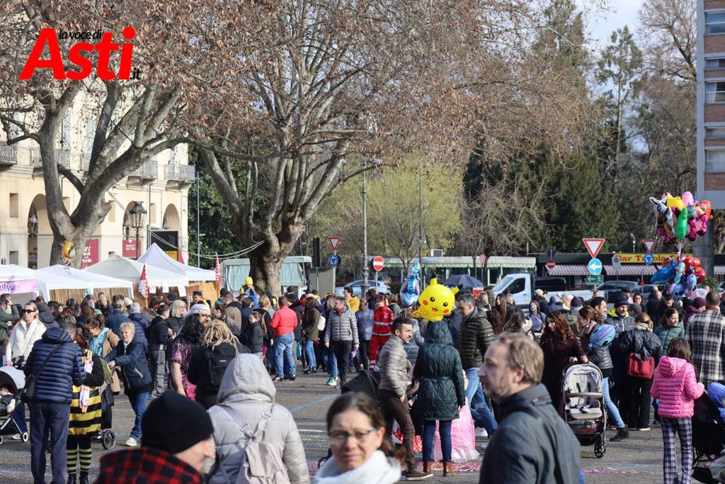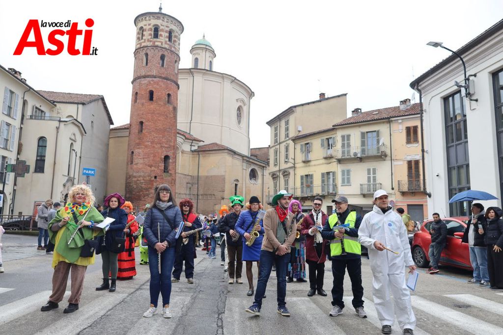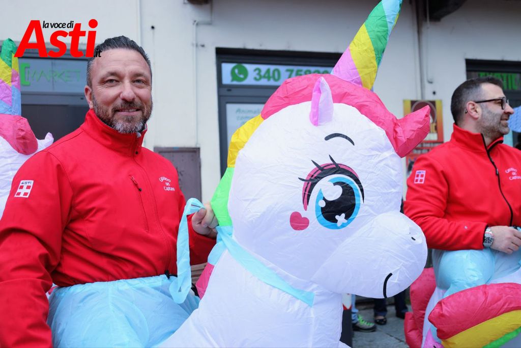 Nonostante il maltempo, la sfilata ha avuto luogo come previsto, prendendo il via alle 14.30 da Corso Alfieri. Il corteo, durato circa un quarto d’ora, ha visto la partecipazione di diversi comitati Palio e associazioni locali. Tra i gruppi mascherati, il Capitano del Palio ha sfilato ironicamente con palloncini a forma di unicorno al posto dei tradizionali cavalli. Presenti anche gruppi ispirati al mondo del circo, a Harry Potter e ai Mini Minions. A chiudere il corteo sono stati i Vespisti Astigiani, con una mascherata su due ruote.