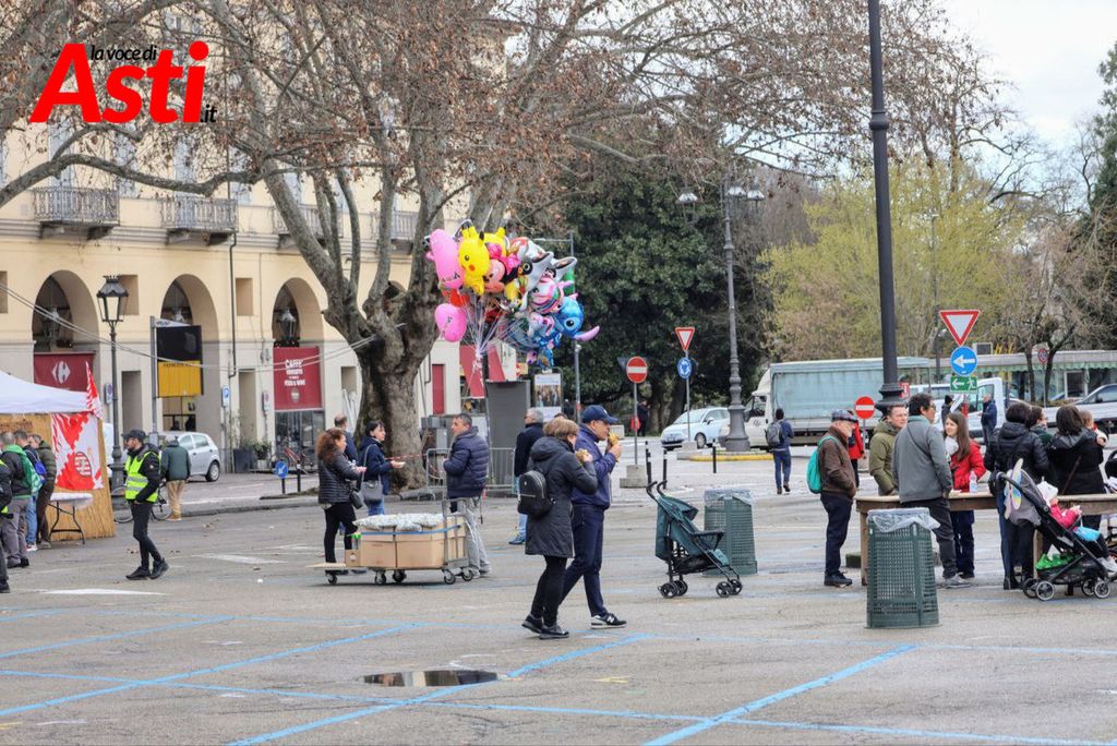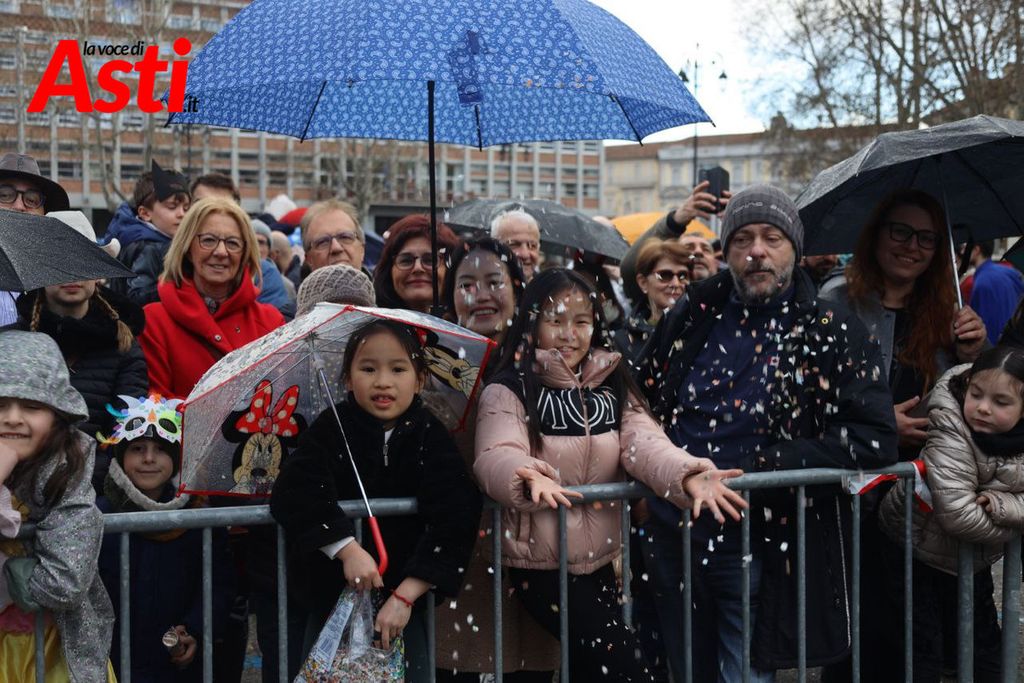 Dopo cinque anni di assenza, il Carnevale Astigiano è tornato, ma il meteo non è stato favorevole. La pioggia, prevista solo come incognita, ha invece accompagnato gran parte della giornata, creando disagi già dal mattino in piazza Alfieri, dove gli stemmi esposti sono stati colpiti dalla pioggia.