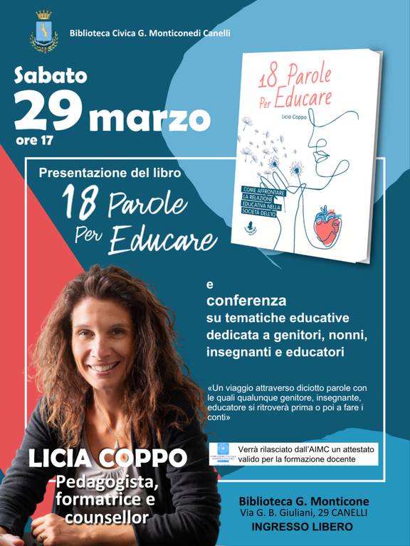 Sabato 29 marzo 2025, alle ore 17, presso i locali della Biblioteca Monticone, a Canelli, verrà presentato il primo libro della pedagogista Licia Coppo dal titolo “18 parole per educare. Come affrontare la relazione educativa nella società dell’Io.”, pubblicato da Il Brucofarfalla edizioni.