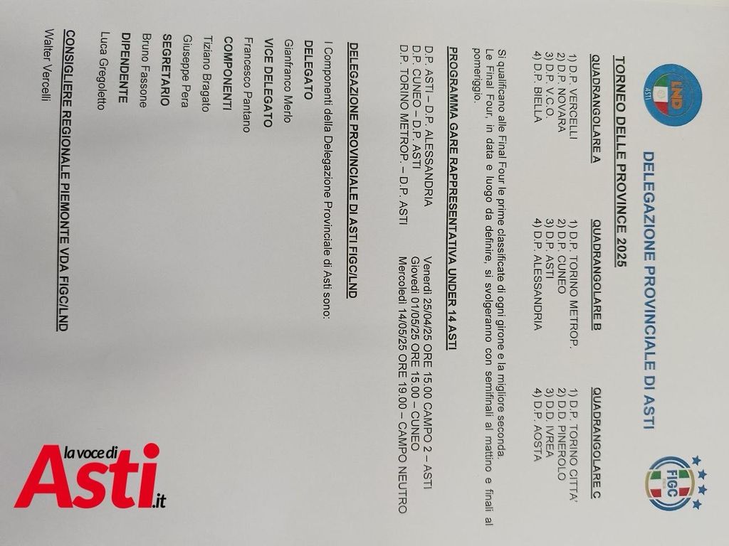 La delegazione astigiana è inserita nel Girone B insieme a Torino Metropolitana, Cuneo e Alessandria. Solo la prima classificata e la miglior seconda dei tre gironi accederanno alla fase finale, con semifinali e finale in programma successivamente e in sede da stabilire.