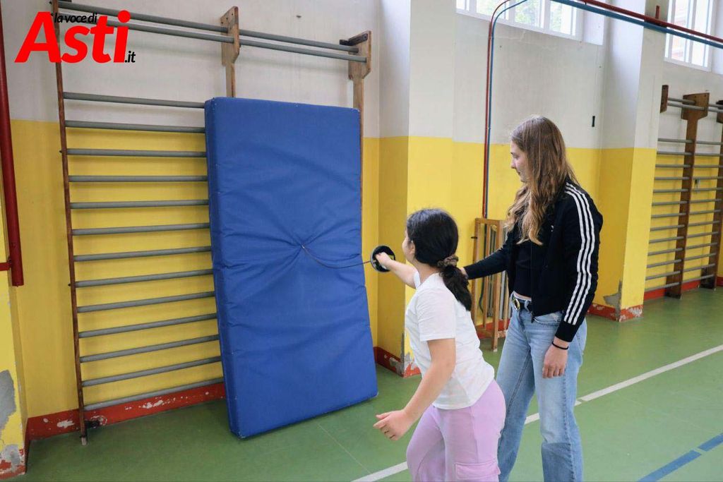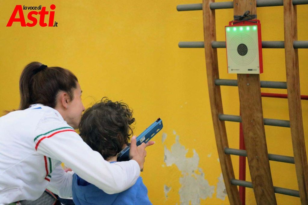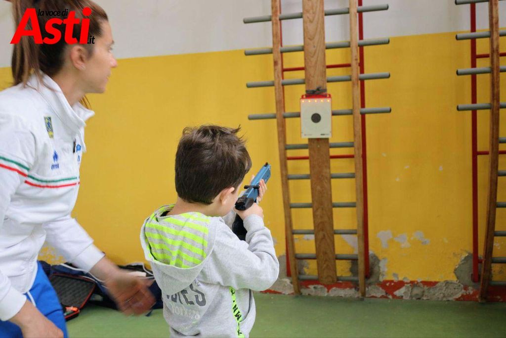 L’entusiasmo ha acceso la palestra della Baracca: i bambini si sono cimentati nel tiro a segno e nella scherma, guidati da Alice Sotero e da Valentina Martinescu, giovane promessa del pentathlon astigiano.