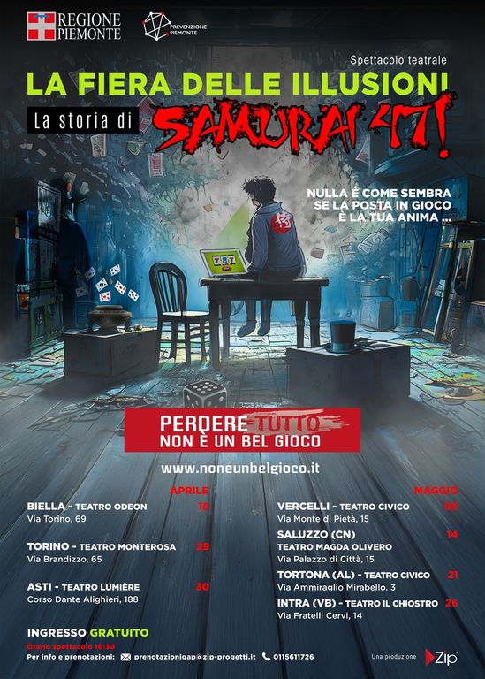 Dopo il successo della scorsa edizione, torna in Piemonte l’iniziativa di sensibilizzazione contro il gioco d’azzardo patologico rivolta agli studenti delle scuole superiori. Nell’ambito delle attività avviate dalla Regione Piemonte a partire dal 2023 per il contrasto alla diffusione del GAP (Gioco d’Azzardo Patologico), martedì 30 aprile farà tappa anche ad Asti, al Teatro Cinema Lumiere, lo spettacolo teatrale “La fiera delle illusioni”, accompagnato da un momento di approfondimento con l’intervento di un esperto e una testimonianza diretta.