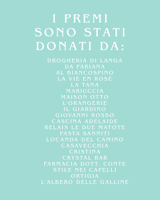 Si ringraziano le aziende del territorio che hanno messo a disposizione i premi per rendere ancora più preziosa questa giornata: Drogheria di Langa, Da Fabiana, Al Biancospino, La vie en rose, La Tana, Mariuccia, Maison Otto, L’Orangerie, Il Giardino, Giovanni Rosso, Cascina Adelaide, Relais Le Due Matote, Pasta Sanniti, Locanda del camino, Casavecchia, Cristina, Crystal Bar, Farmacia Dott. Conte, Stile nei Capelli, Ortigia, L’albero delle galline, Basikdue.