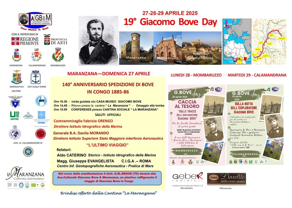 Come da tradizione, anche quest’anno verrà celebrato il “Giacomo Bove Day”, l’appuntamento organizzato dall’associazione culturale Giacomo Bove e Maranzana, volto a commemorare il grande esploratore.