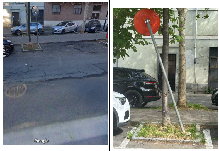 Secondo quanto riportato dall’interrogazione, lo specchio sarebbe inclinato da oltre un mese, con il pericolo che possa staccarsi e cadere su veicoli in sosta.