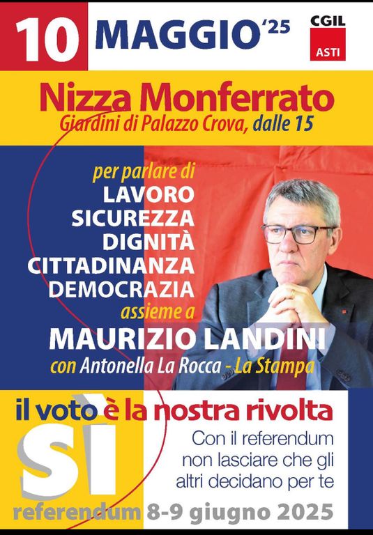 Avrà luogo, sabato 10 maggio a Nizza Monferrato, l’incontro con il segretario nazionale della Cgil, Maurizio Landini, in occasione dell’iniziativa elettorale volta a informare la cittadinanza sui referendum su lavoro e cittadinanza.
