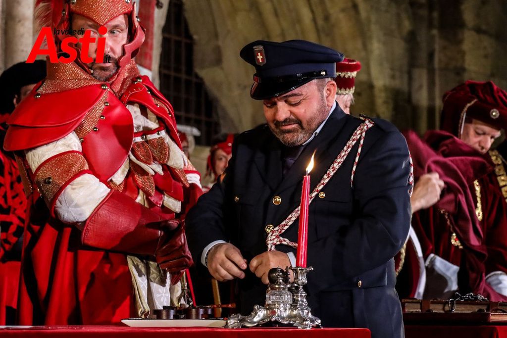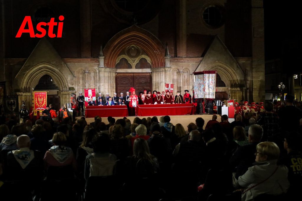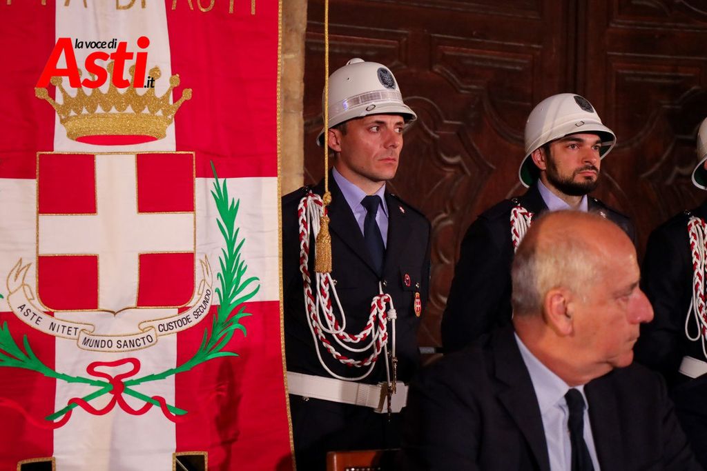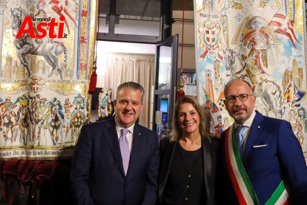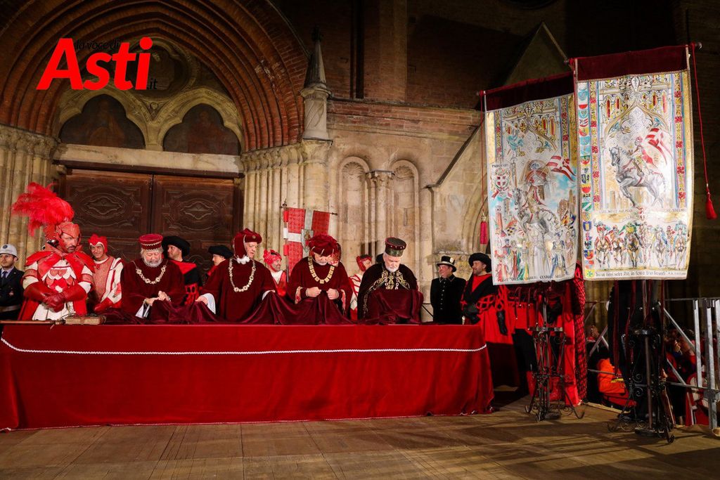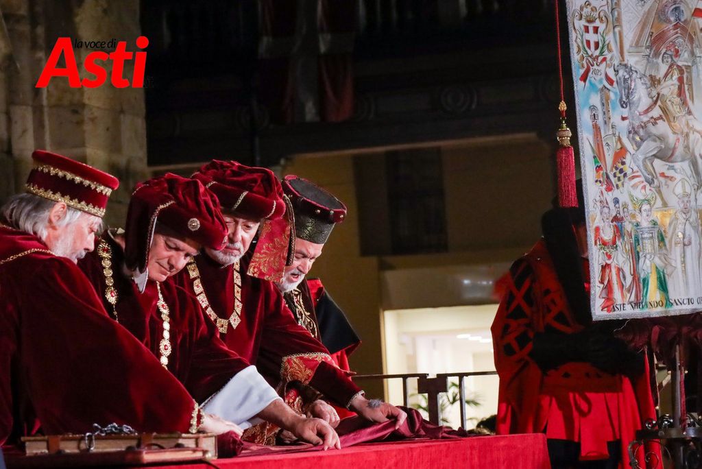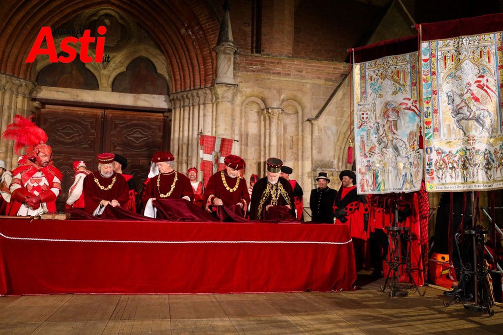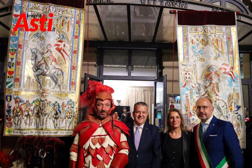 A rendere ancora più ricco il quadro simbolico, la scritta latina "Sicut Fieri Solet Ast, in festa Beati Secundi" (Come si è soliti fare ad Asti nella Festa di San Secondo) tratti dal memoriale del Ventura del 1275 e testimonianza scritta più antica della corsa - un richiamo esplicito al 750° anniversario del Palio - disputato attorno alle mura di Alba in segno di scherno per la città rivale.