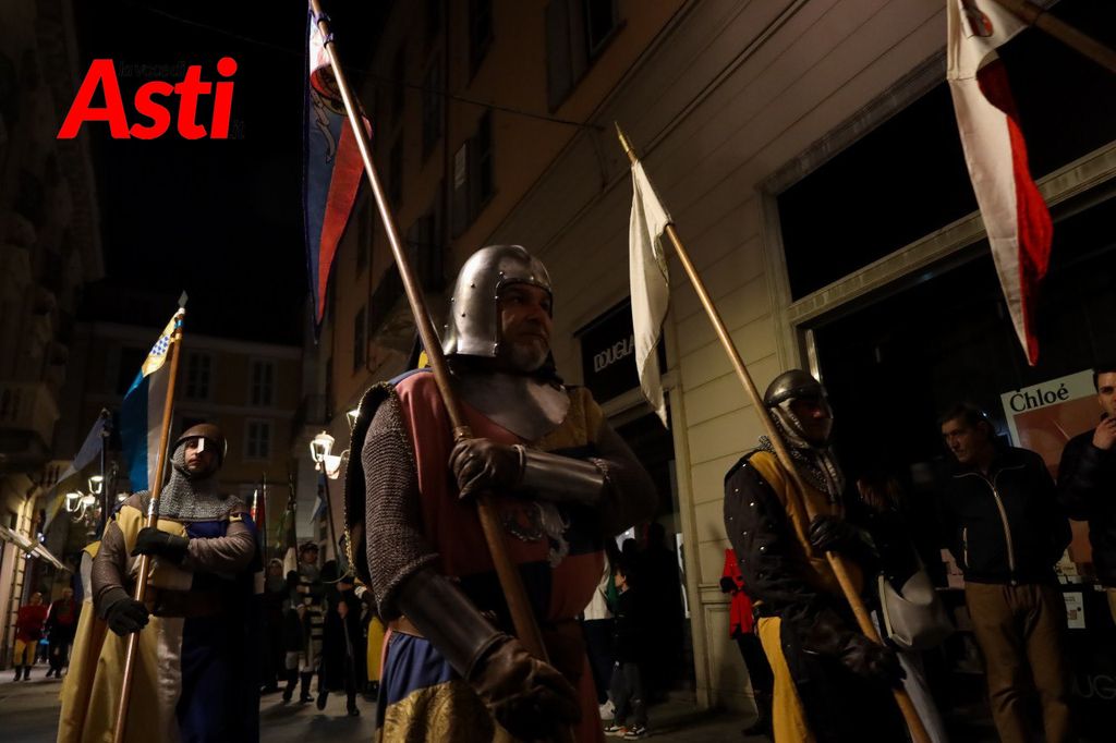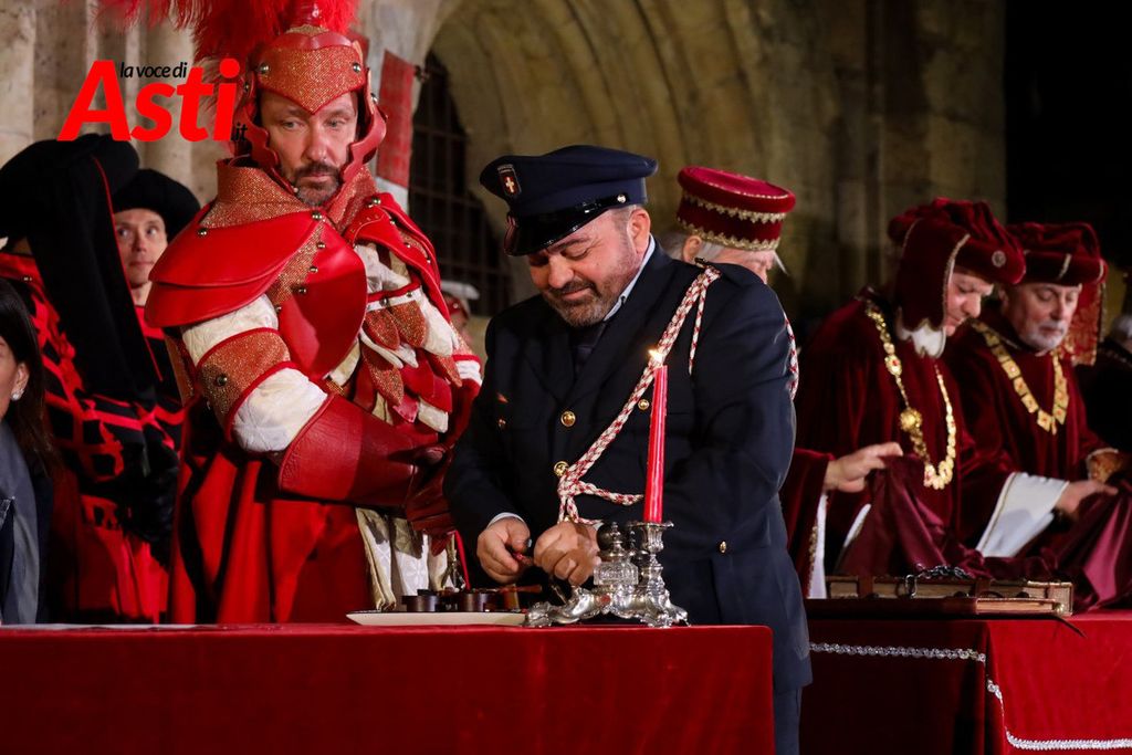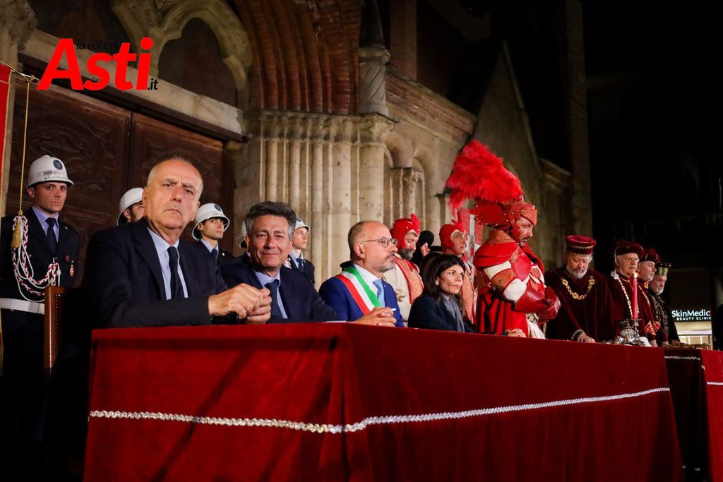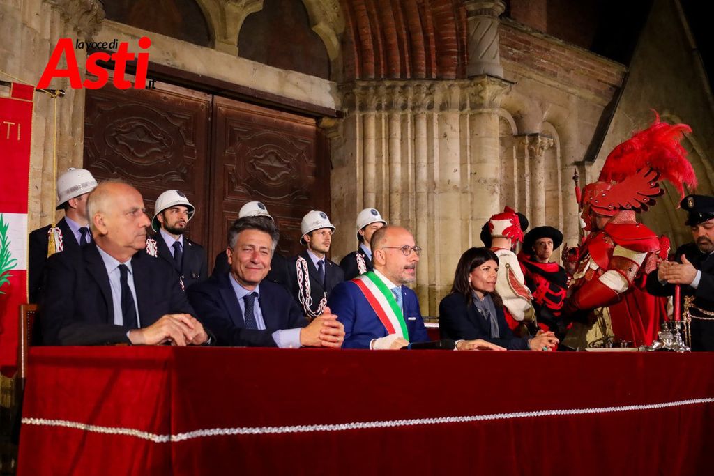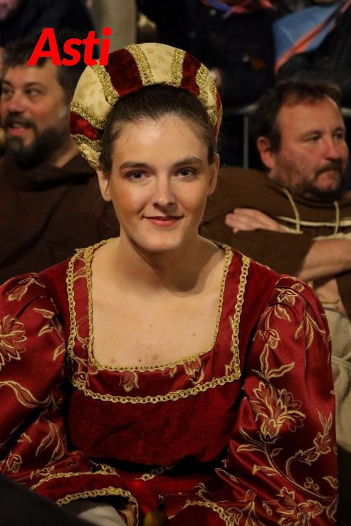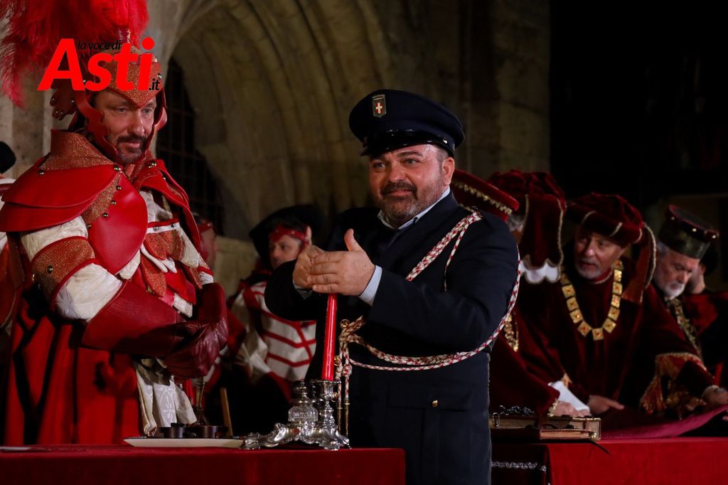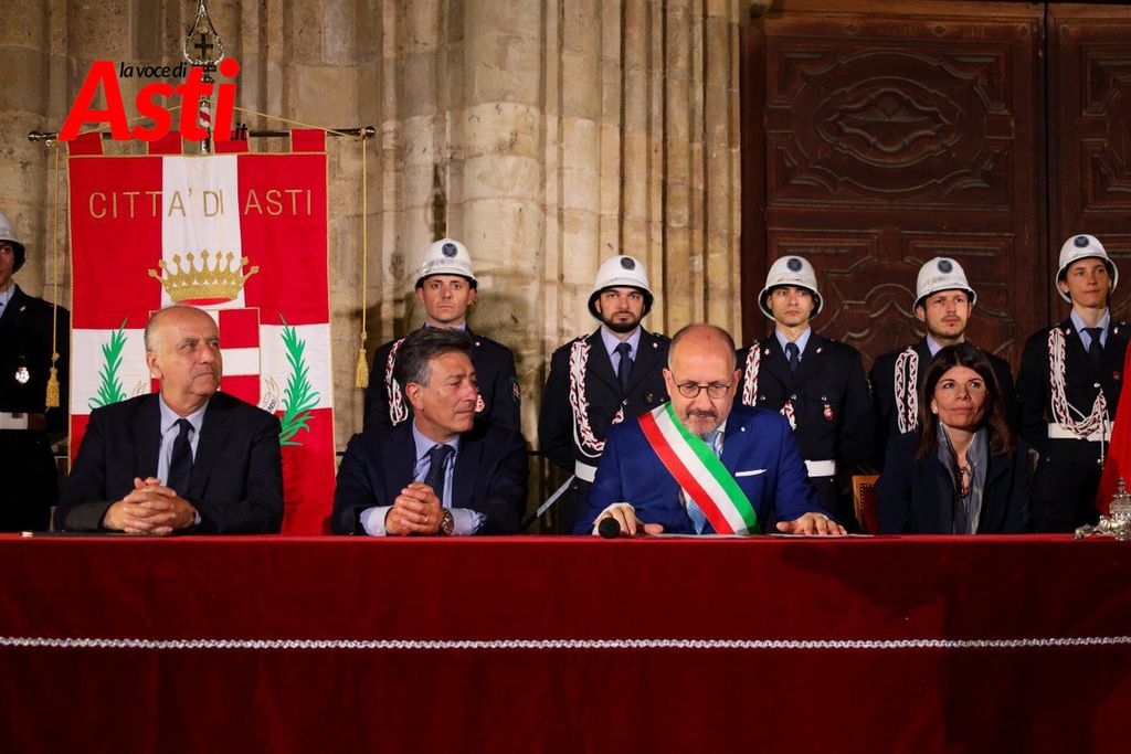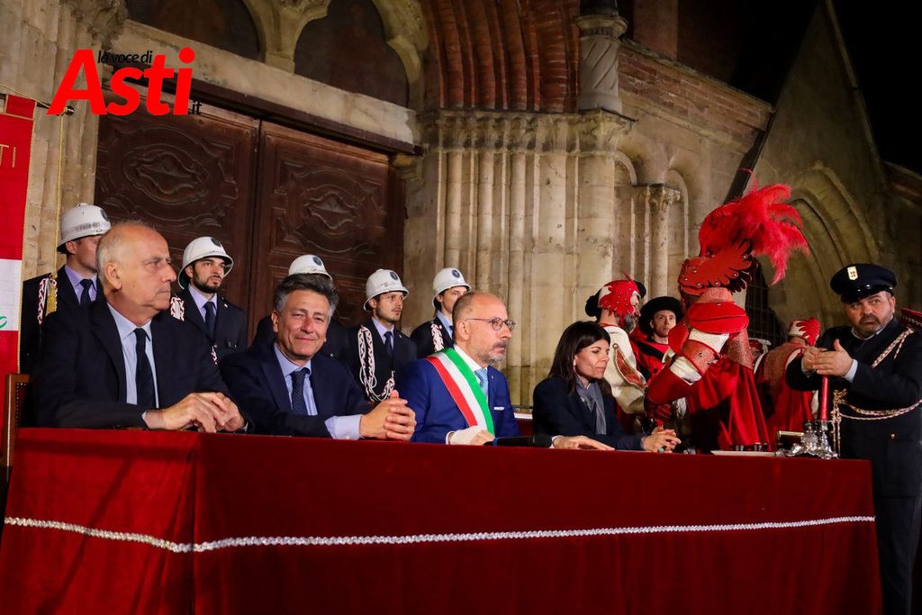 A rendere ancora più ricco il quadro simbolico, la scritta latina "Sicut Fieri Solet Ast, in festa Beati Secundi" (Come si è soliti fare ad Asti nella Festa di San Secondo) tratti dal memoriale del Ventura del 1275 e testimonianza scritta più antica della corsa - un richiamo esplicito al 750° anniversario del Palio - disputato attorno alle mura di Alba in segno di scherno per la città rivale.