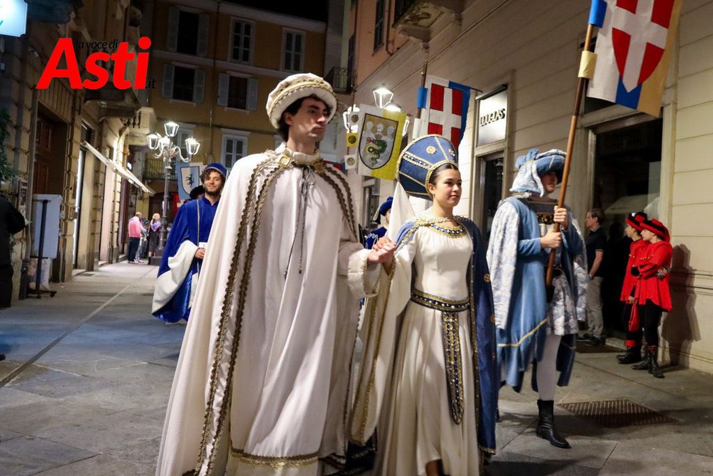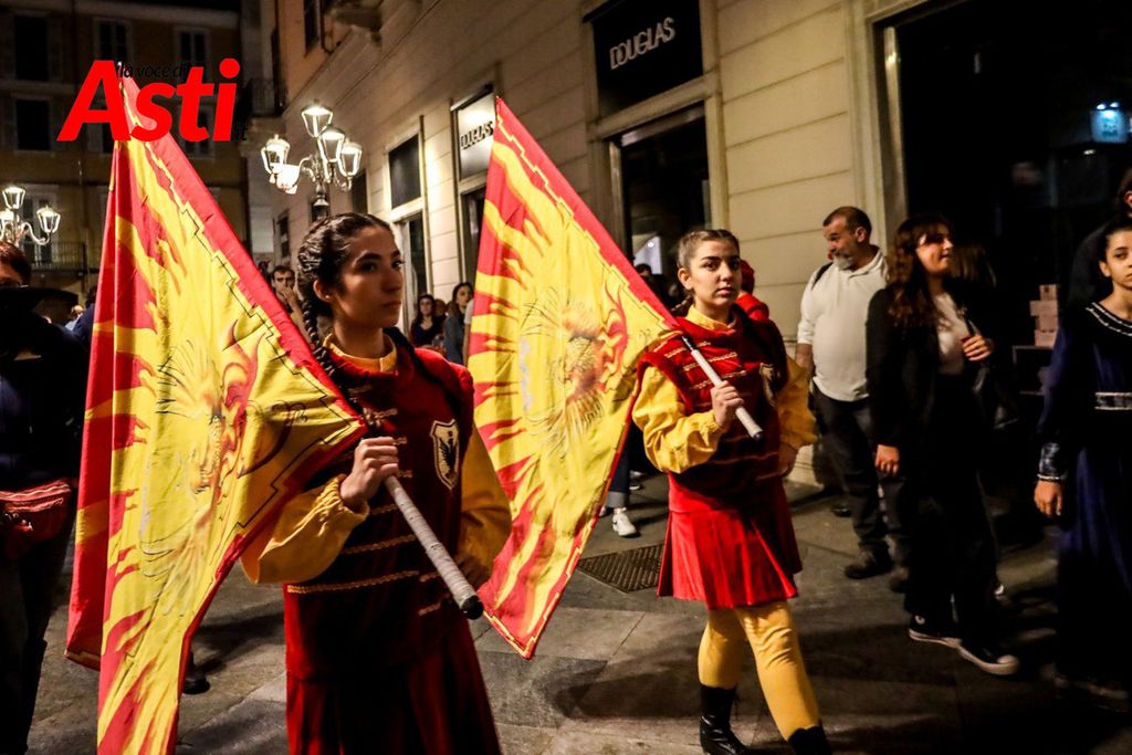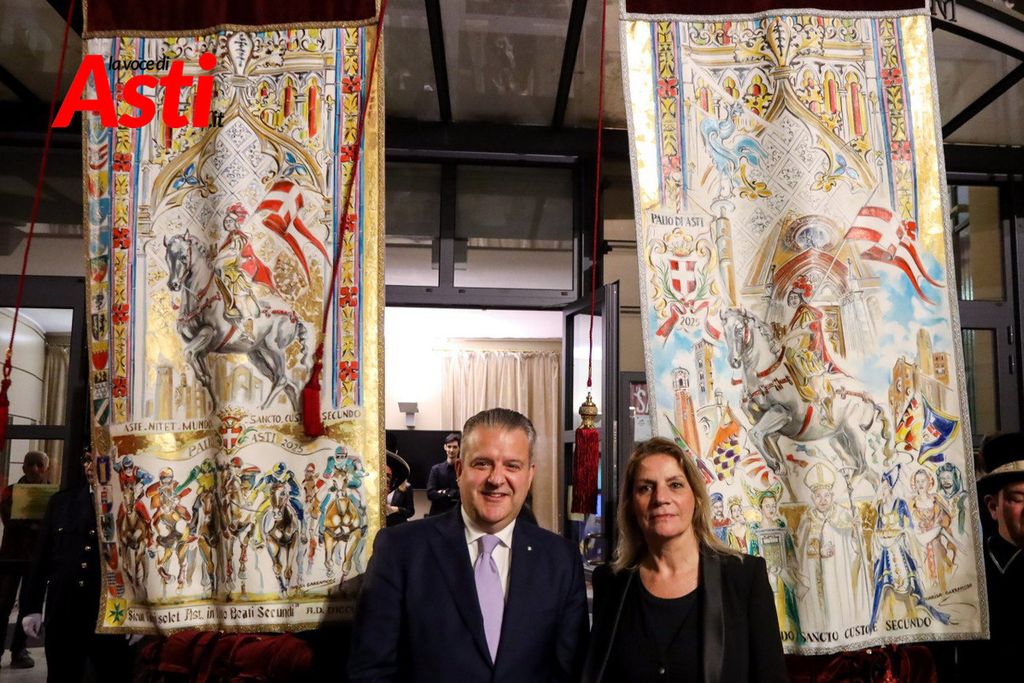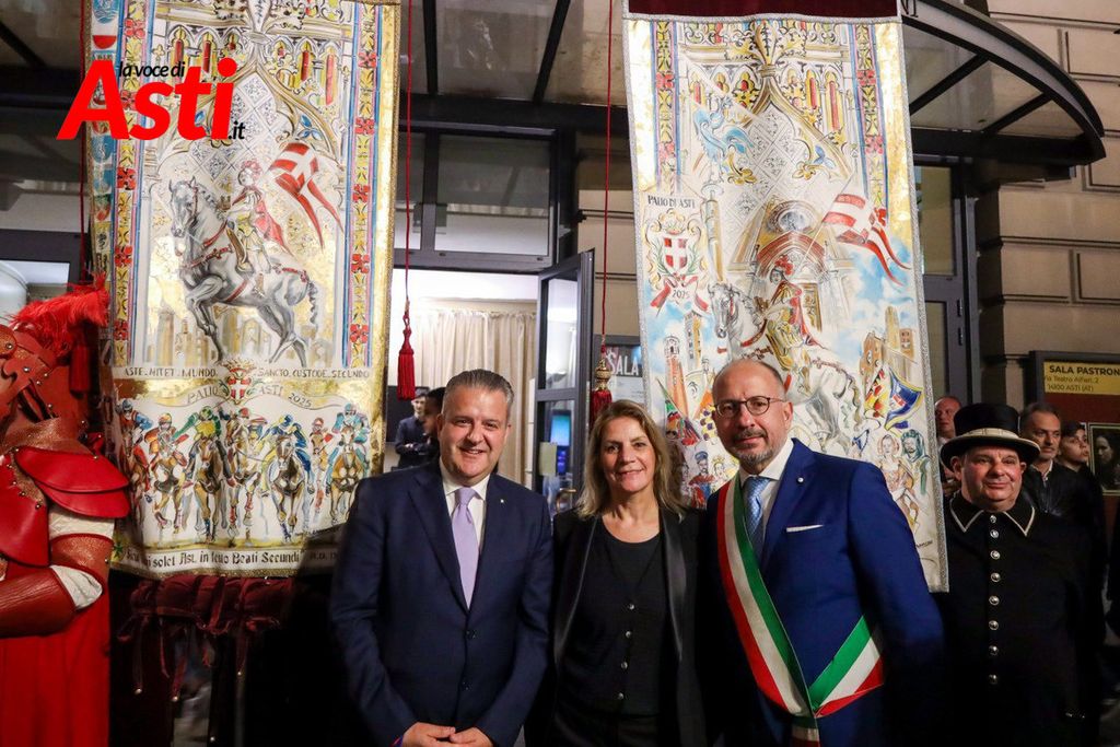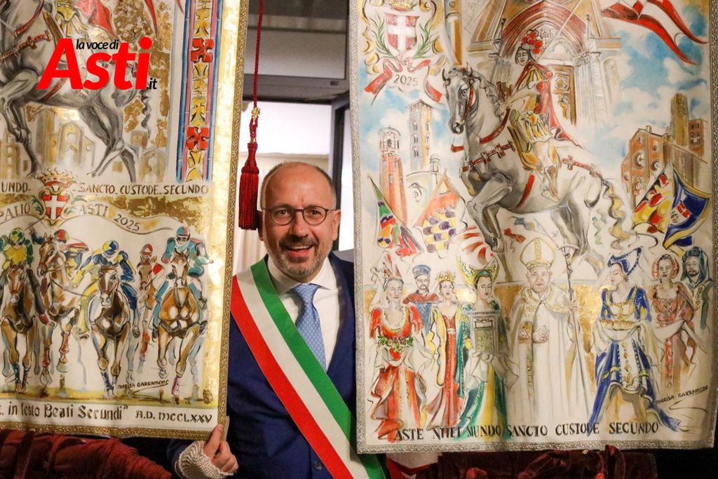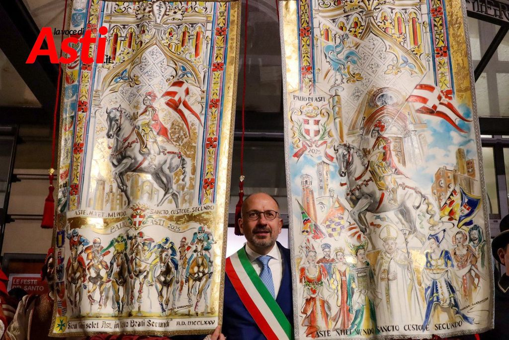 A colpire immediatamente l’occhio sono le tonalità predominanti del sendallo: oro e bianco dominano la scena, con accenti più scuri nella parte superiore. Un richiamo, per alcuni, al Rione San Silvestro, che non conquista la vittoria dal lontano 1992. Ma l’analisi non si ferma al colore: la cornice che circonda l’immagine di San Secondo a cavallo è decorata con strisce laterali rosa e azzurre – un accenno forse a Santa Maria Nuova – mentre il motivo floreale, rosso e giallo, potrebbe evocare Nizza o San Paolo.