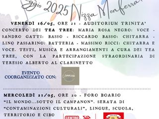 Venerdì 16 maggio, alle 21, l’Auditorium della Trinità ospiterà il concerto dei Tea Tree, una proposta poetica e di amicizia, che vedrà esibirsi il gruppo composto da Maria Rosa Negro (voce), Sandro Gatti (Basso), Riccardo Basso (chitarra), Lino Passarino (batteria), Massimo Ricci (chitarra e voce), con la partecipazione di Alberto Teresio al clarinetto.