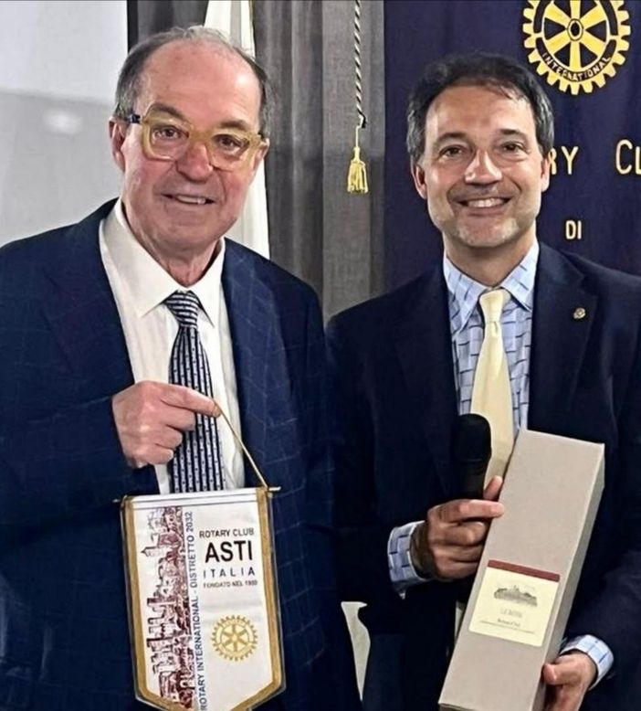 Al termine dell’incontro, il presidente del Rotary Club Asti, Alberto Bazzano, ha omaggiato l’autore con il gagliardetto del club e una Magnum di vino astigiano, ringraziandolo per l’intensa testimonianza culturale.