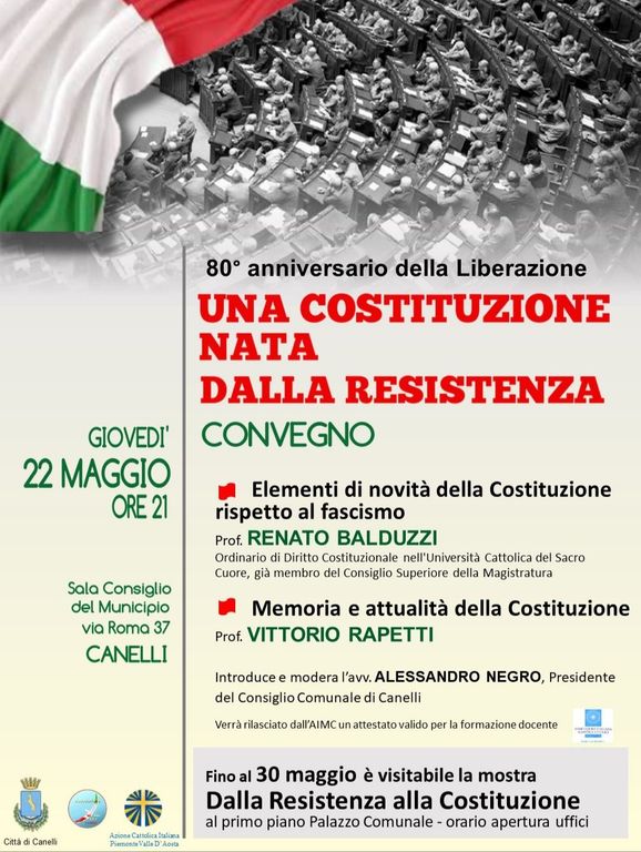 Inoltre, fino al 30 maggio, al primo piano del palazzo comunale, prosegue la mostra “Dalla Resistenza alla Costituzione”, allestita grazie alla collaborazione tra Memoria Viva Canelli e l'Azione Cattolica Piemonte-Val d’Aosta.