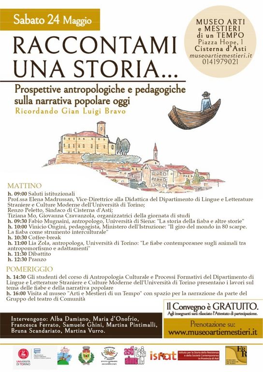 Il convegno in programma, “Prospettive antropologiche e pedagogiche sulla narrativa popolare oggi”, inizierà alle 9 con i saluti istituzionali; mentre, dalle 9.30 alle 12.30, seguiranno gli interventi dell’antropologo Fabio Mugnaini con “La storia della fiaba e altre storie”, del pedagogista Vinicio Ongini con “Il giro del mondo in 80 scarpe. La fiaba come strumento interculturale”, e l'antropologa Lia Zola con “Le fiabe contemporanee sugli animali tra antropomorfismo e adattamenti”.