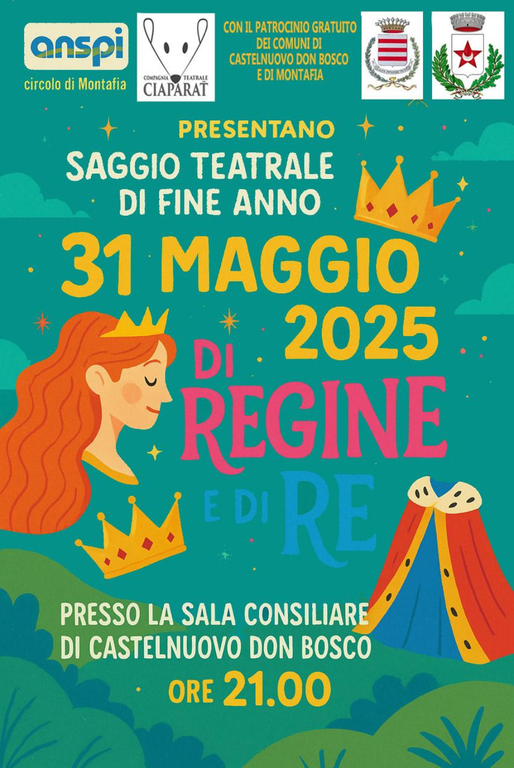 Nella sala consiliare del Comune di Castelnuovo Don Bosco, il 31 maggio alle 21, adulti e bambini si esibiranno in uno spettacolo teatrale dedicato a re e regine.
