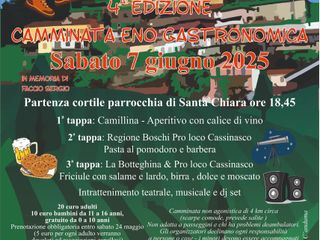L’evento inoltre prevede tre tappe, dove sono previste degustazioni enogastronomiche: aperitivo con calice di vino alla tappa Camillina, pasta al pomodoro e barbera in regione Boschi e friciule con salame e lardo, birra, dolce e moscato in tappa “La Botteghina”.